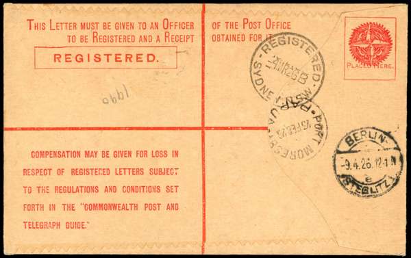 1926 (23 FE) 4d orange registered p/s envelope, size G, addressed (on official address label with ‘TREASURY’ h/s in violet) to Berlin and uprated with 1916-31 2d, cancelled by Port Moresby cds with red/white registration label below, backstamped at Syndey (4 MR) and Berlin (9.4.26), very scarce. Ex Troy (Prestige 28 Jul 2009, lot 2271).