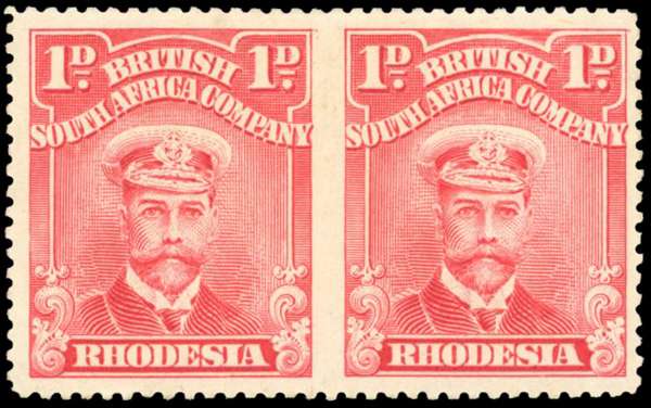 1913-19 1d rose-red (shaded ear), perf 15, horizontal pair error IMPERFORATE BETWEEN, fresh large part o.g. A couple of minuscule black specks on the gum mentioned strictly for accuracy nevertheless a lovely example of this major Rhodesian rarity. Only three such pairs known, this being the finer of all the three in our opinion. Ex Vestey (Spink 17 Jun 2014, lot 86), ‘Shiloh’ (Sotheby's 28 Nov 1984, lot 431) and Simpson (Sotheby's 2 Dec 1982, lot 1220) with BPA cert (2007). SG 204a, cat £18,000