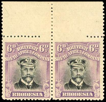 1918-21 6d grey-black and reddish purple, die IIIB, perf 14, horizontal pair from top of sheet, variety horizontal perforations at top omitted for 18mm, very fine o.g. with the stamps remaining unmounted, a spectacular showpiece which is probably unique. Ex Vestey (Spink 17 Jun 2014, lot 230) and Shapland (CRL 9 Jun 1993, lot 1954). SG 265 var.