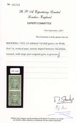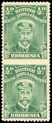 Rhodesia 1922-24 ½d dull green perf 14 vertical pair error Imperf Between