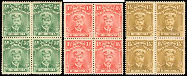 Rhodesia SG 288/290 1922-24 ½d, 1d, 1½d perf 15 blocks of 4 unmounted