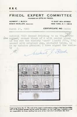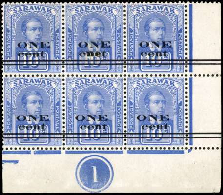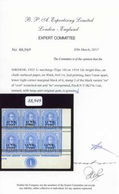 1923 (Jan) 1c on 10c bright blue, type 18 surcharge, second printing with bars ¾mm apart, lower right corner block of 6 (3x2) with plate number '1', R9/5 showing the remarkable variety 'en' of 'Cent' scratched out and 'ne' oveprinted, in a misguided attempt to reproduce the original R9/5 'Cnet' error of the first printing, o.g., one normal with minor gum blemishes, still very fine for this fascinating rarity, of which only 13 existed. BPA cert (2017). SG 74c/ca, cat £9900+