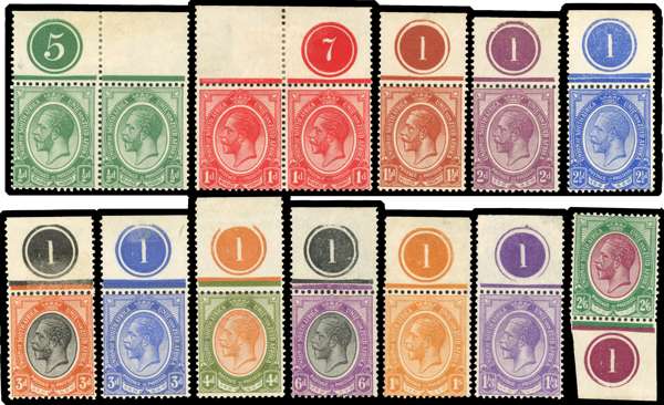 1913-24 set of 15 to £1, upper or lower marginal singles (½d, 1d pairs) with plate number, mostly fine large part o.g. to o.g., attractive. SG 3/17, cat £950+