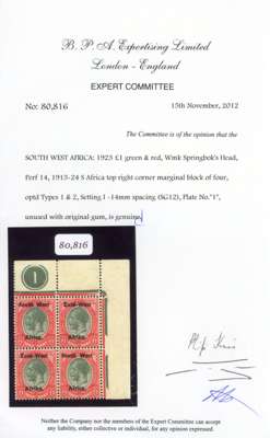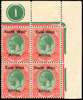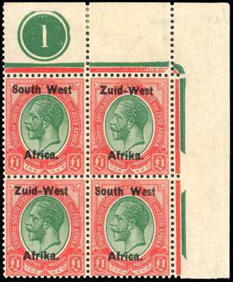 SWA South West Africa 1923 £1 green and red, Setting I PLATE BLOCK UM S.G. 12