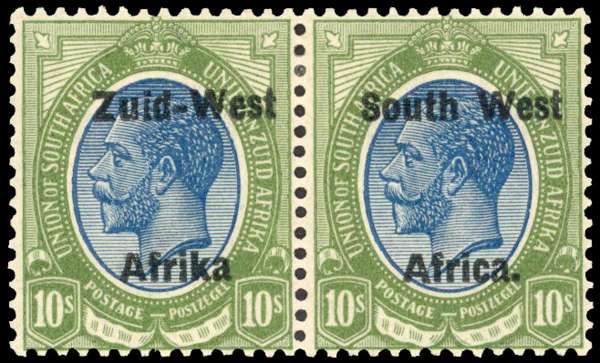 1923 (31 Mar) 10s blue and olive-green, setting II, horizontal pair showing variety 'Afrika WITHOUT STOP' on left stamp (R6/1), fresh and fine large part o.g. Rare, only 40 possible. S.G. 14a cat £2,750 BPA Cert (2000).