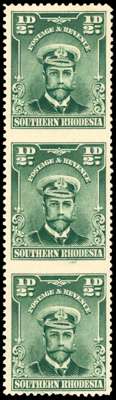 Southern Rhodesia 1924-29 ½d blue-green, vertical strip of three, error IMPERFORATE BETWEEN S.G. 1d