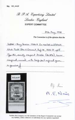 Army Service. 1906-11 5m scarlet and black, type A3 opt, error OPT DOUBLE, marginal from foot of sheet, large part o.g., fractionally toned still fine. BPA cert (1998). SG A9a, cat £450