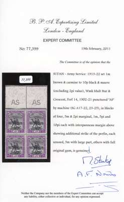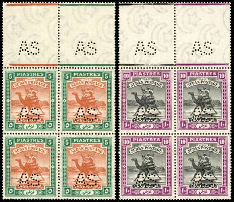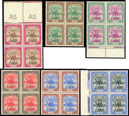 Army Service. 1912-22 original set of 8 to 10p, ordinary paper (exclg 2pi purple and orange-yellow), perf 'AS', in blocks of 4, unmounted o.g. (except upper pair of 3m), some low values with faintly toned gum nevertheless an outstanding group of this issue, with five blocks marginal, the 1m, 5p and 10p each with full interpane margin above (showing addiitional strikes of the perfin). Ex King Farouk, with BPA cert for the set (2011). SG A17/A25 btwn, cat £3980+