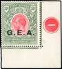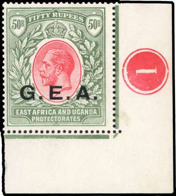 1917-21 'G.E.A.' 50r carmine and green, lower right corner example with plate number, fresh unmounted o.g. SG 62, cat £750+