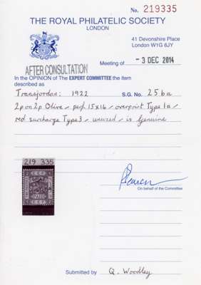 Transjordan 1922 2p on 2p olive perf 15x14 surcharge in red and overprint type 1a