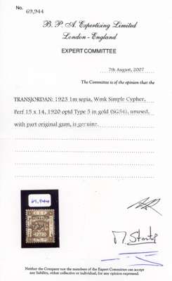 Transjordan 1923 1m sepia type 5 opt in gold perf 15x14