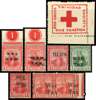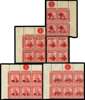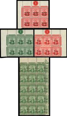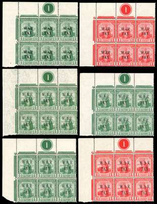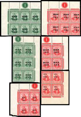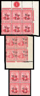 Red Cross and War Tax. Very useful collection on stock pages, commences with 1914 Red Cross label followed by 1915 and 1916 Red Cross 1d plate blocks of 4, then a splendid range of War Tax issues as plate blocks plus various errors and varieties incl 1917 (Oct) 1d opt inverted block of 4 (2016 BPA cert), 1918 (Jan) 1d opt inverted, and 1918 (Feb) ½d block of 15 with misplaced opt, cond varies but much is fine large part o.g. to o.g., viewing recommended. SG 157/189, cat £2000+
