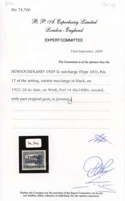 1929 3c on 6c slate. type 101 surcharge in BLACK, fresh large part o.g. BPA cert (2009). SG 188b, cat £1500