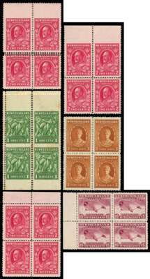1932 ‘Resources’ issue, interesting range on stock pages comprising set of 12 to 30c plus various perf changes incl 25c line perf (pair), 1c block of 4 with double vertical perfs and imperf horizontally (toned), 2c treble perfs, 3c double perfs, 2c (block of 4) and 14c (vert pair) imperf to margin, 20c block of 4 with offset on gum, and the set in blocks of 4, cond varies but mostly fine, large part o.g. to o.g. SG 209/220, min cat £900+