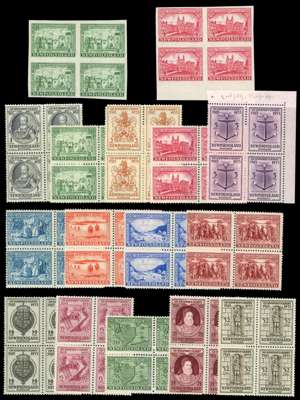 1933 ‘Gilbert’ issue, useful range comprising set to 32c, line perf 7c, 9c, 14c, 20c, 24c and 32c, imperf pairs (1c, 24c) and blocks of 4 (2c, 4c), and the set in blocks of 4, cond varies but mostly fine large part o.g. to o.g. SG 236/249a, cat £1330+