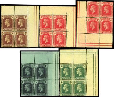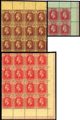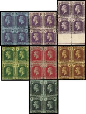 1921-26 wmk MCA set to 10s with additional 3d on pale yellow, 4d and 1s, and Script wmk set to 10s with additional ¼d, ½d, 1½d, 3d, 4½d, 6d, 1s, and 3s, all in blocks of 4, plus wmk MCA 4d corner block of 16 and Script wmk 3d marginal block of 12 (4x3), the latter on thinner striated paper, generally fine to very fine o.g. or unmounted o.g., a rare set of multiples. Ex Vestey (Spink 24 Sep 2015, lot 223). SG 60/83, cat £1266+