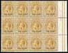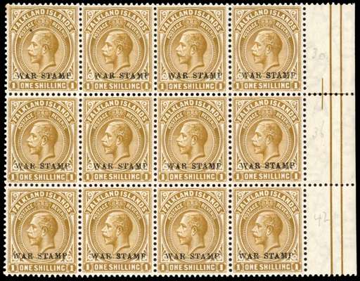 1918-20 War Stamp 1s light bistre-brown, right marginal block of 12 (4x3), very fine o.g. with most stamps remaining unmounted, a very scarce multiple. SG 72, cat £660+