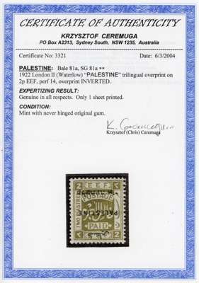 1922 2p olive, type 8 opt, perf 14, error OVERPRINT INVERTED, fine unmounted o.g., only one sheet existed. Ceremuga cert (2004). SG 81a, cat £325