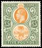 1921-27 £5 orange and green, Script wmk, large part o.g., a fine example of this handsome high value. SG 148, cat £4000