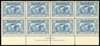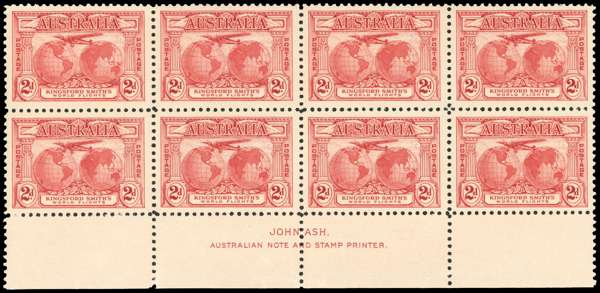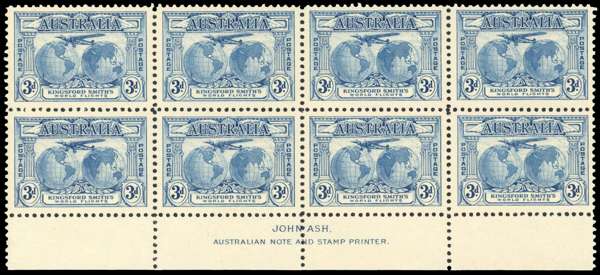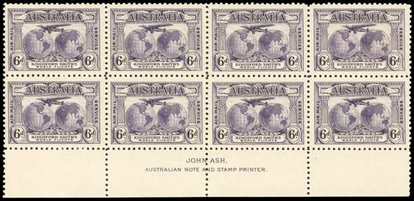 1931 (19 Mar) Kingsford Smith set of 3 to 6d violet, each in matching lower marginal blocks of eight with "JOHN ASH" imprint, fresh unmounted o.g. Fine and attractive in this positional form. S.G. 121/3