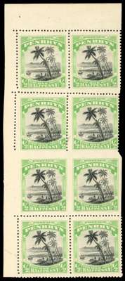 Penrhyn. 1920 ½d black and emerald, upper left corner block of 8 (2x4), the centre block of 4 error PART IMPERFORATE, o.g., minor bends still spectacular and rare. SG 32a, cat £1800