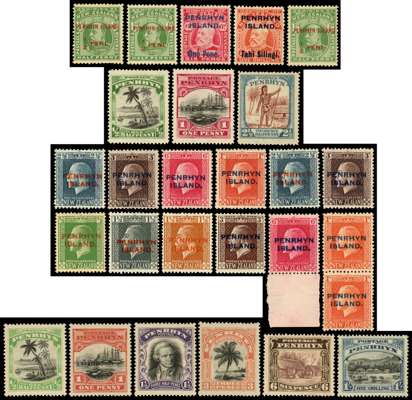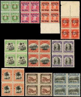 Penrhyn. 1914-1929 range on stock pages comprising 1914-15 set of 3 to 1s plus set in blocks of 4, 1917-20 perf 14x13½ and perf 14x14½ sets of 4 to 1s plus perf 14x13½ 1s block of 4, 1917-20 typo set of 4 to 3d, 1920 set of 6 to 1s plus set in blocks of 4, and 1927-29 set of 3 to 2½d, large part o.g. to o.g., slightly mixed cond but much is fine. SG 19/40 btwn, cat £713