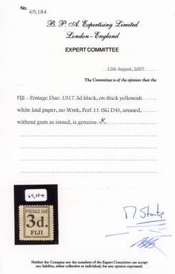 Postage Due. 1917 3d black on thick laid paper, unused without gum as issued, a fine example. Only 1116 issued, most of which were used. BPA cert (2007). SG D4, cat £650