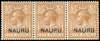 1916-23 5d yellow-brown, horizontal strip of 3, the centre stamp variety ‘NAUP.U’, fresh large part o.g., a fine example of this rarity. SG 9a, cat £2250