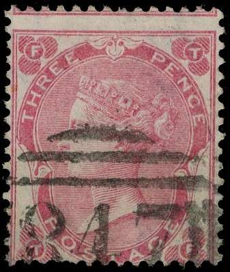 1862 3d Bright carmine rose Pl.2 (Wmk. Error three roses and a thistle, W20b). Used example lettered TF showing error of watermark variety three roses and a thistle, neatly cancelled by Warrington ‘847’ numeral cancellation. A lovely example of this scarce watermark variety. SG 76a Cat £5,500.