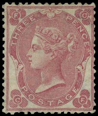 1862 3d Rose Pl.3 (Unofficial line perf 14). Unused o.g. example of this rare perforation variety lettered CF. A few blunt perforations, well above average for this abnormal issue. Spec. J27a. Cat £14,000.