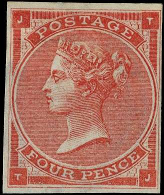 1862 4d Bright red Pl.3. (Without hair lines). Unused o.g. imperforate imprimatur lettered TJ. Scarce, one of only 25 possible examples many of which are in institutional collections. Cat £4,000.