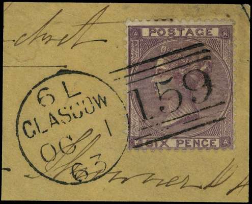 1862 6d Lilac Pl.3. Used example (KA) tied to a small piece of yellow envelope by a crisp Glasgow ‘159’ duplex for OC.1.1863. showing the rare hyphen omitted variety. Cat £7750.