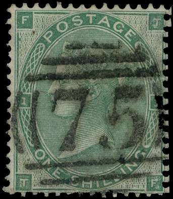 1862 1s Green Pl.1=2. (Error of Wmk, W20b Three Roses & Thistle) Used example lettered TF with watermark error three roses and thistle, cancelled by a Birmingham "75" numeral. Scarce variety, reperforated at foot and a small tones spot at top left nevertheless very rare. 2014 PTS Cert.