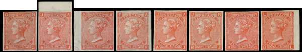 1865 4d Vermilion Pl.7-14. Very fine unused o.g. complete group of eight imperforate imprimaturs from each plate (Pl.7, 8, 9, 10, 11, 12, 13 & 14). Cat £20,000.
