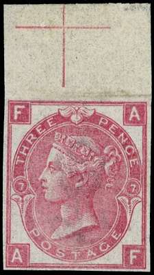 1871 3d Rose Pl.7. Unused o.g. imperforate top marginal imprimatur lettered AF. Scarce, one of only 22 possible examples many of which are in institutional collections. Cat £2500.