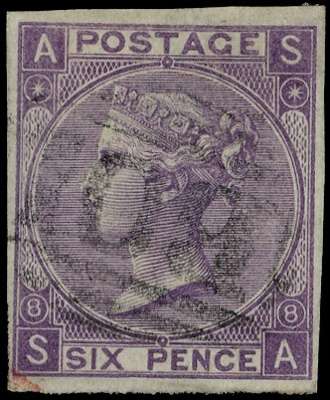 1869 6d Dull violet Pl.8. Used imperforate example lettered SA, cancelled by an Alexandria “B01” numeral cancellation. Very rare imperforate example. Cat £4000.