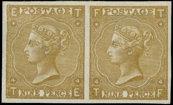 1867 9d Straw Pl.4. Superb unused o.g. imperforate horizontal pair lettered TE-TF. A wonderful Victorian variety of the utmost rarity, believed to be one of only two imperforate pairs recorded in private hands. Cat £44,000.