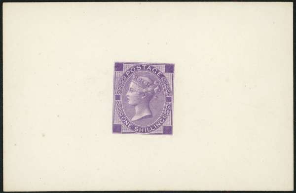 1870 1s Die proof without corner letters or plate numbers printed in deep mauve on white matt card (92 x 60mm). Produced by DLR for display at the 1870 International Exhibition. Very rare, only two or three examples are believed to exist in each colour Cat £7,500.