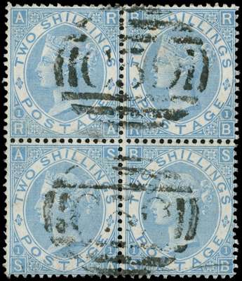 1867 Milky Blue Pl.1. Used block of four (RA-SB) cancelled by a pair of contrary to regulations Jacmel, Haiti ‘C59’ numeral cancellations. A couple short perforations nevertheless a spectacular multiple of this difficult shade. 1983 RPS Cert.