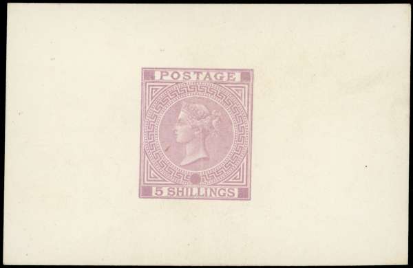 1870 5s Die proof printed in mauve on white matt card (92 x 60mm), produced by DLR for the 1870 International Exhibition. Very rare only one or two examples exist in each colour in private hands. Cat £18,000.