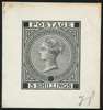 1874 5s Die proof Pl.3. Die proof for the intended plate 3 without corner letters or plate numbers printed in black on white glazed card (44 x 48mm) initialled in manuscript at lower right “J.P.” and on reverse “Die made for plate 3 which proved defective/ C”. An important working piece. Cat £5,000.