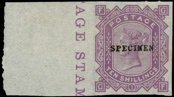 1878 10s Colour trial Pl.1. Imperforate left hand marginal example lettered GF printed on gummed watermarked paper in mauve, overprinted "SPECIMEN" type 9. Cat £2,400.