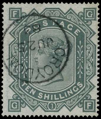 1878 10s Greenish-grey Pl.1. Used example lettered GE, cancelled by a Croydon cds for JU.25.1883. Attractive. SG128 Cat £3,200.