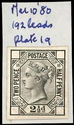 1876 Die proof of the 2½d plate 18 taken from the striking book, printed in black on white glazed card, mounted on thin card and annotated "May 10 '80/ 192 Leads/ Plate 19", very scarce