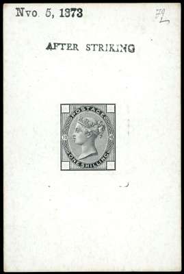 1873 1s Die proof Pl.10. Printed in black on white glazed card (92 x 60mm) endorsed "AFTER STRIKING", dated "NVO 5, 1873" and initialled “FI” in manuscript . Scarce. Cat £2750.