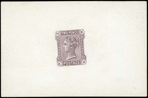 Tender Essay: 1879-80 De La Rue Tender Essay for the 2d composite die proof (92x60mm) of Head ‘B’ and Frame type ‘7’ in brown on white glazed card, fine and rare. SG 168var
