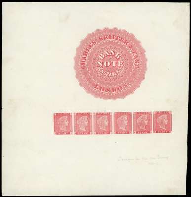 Tender Essay: 1879-80 Charles Skipper & East 1d essay depicting Ceres (facing right) as strip of six in carmine on wove paper with decorative company trade emblem at top, archival crease, attractive. Ex. Alan Gilbert