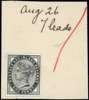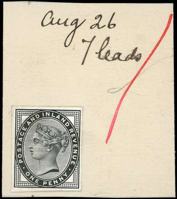 1881 1d lilac striking book piece, on glazed card mounted on buff card (50x56mm) endorsed ‘aug 26 7 leads’ in m/s, and red stroke, fine and scarce. Ex De La Rue Archives SG 170var