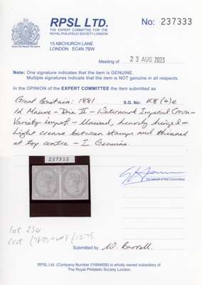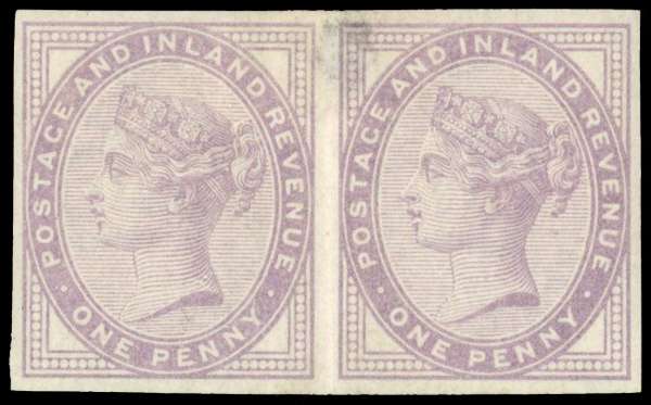 1881 1d mauve (16 dots) imperforate pair, large part o.g. vertical bend to central margin and central thin at top, still fine and scarce. SG 174a, Cat £4500. 2023 RPS Cert