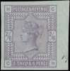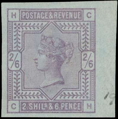 1883-84 2/6d lilac (CH) on blued paper, imperforate imprimatur, fine o.g. with ‘19’ annotation in m/s in right margin, very scarce. SG 175var